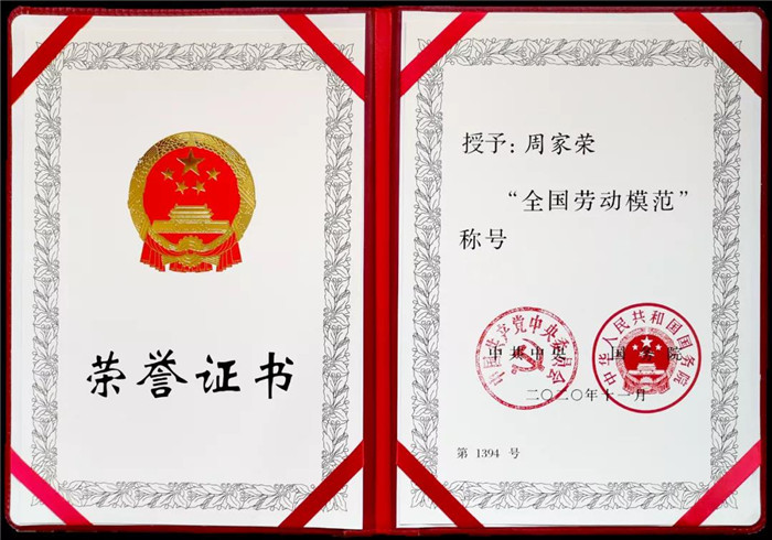 周家榮榮獲“全國勞動模范”榮譽稱號